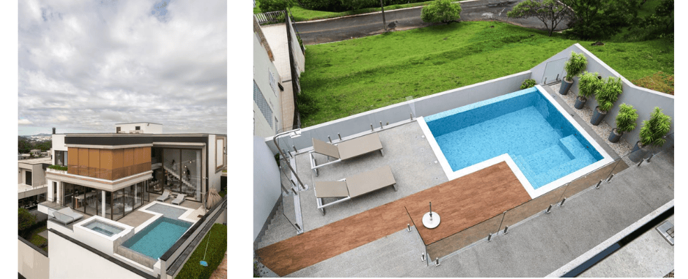 Um exemplo citado pelos arquitetos foi um terreno com cerca de 50 metros de profundidade e 12 metros de declive, localizado em uma região elevada da Serra de São Roque, no interior de São Paulo. A solução encontrada foi criar uma implantação invertida, com a garagem no nível da rua funcionando quase como um mirante. A área social foi posicionada logo abaixo, com deck e piscina elevada, enquanto os dormitórios ficaram no nível inferior, integrados a um jardim.