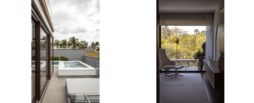 Já em terrenos em declive, a residência acompanha o caimento natural do solo. Nesse caso, torna-se possível aproveitar pavimentos inferiores, algo que muitas vezes não seria viável em terrenos planos. Segundo os arquitetos, essa característica permite integrar diferentes níveis da casa ao relevo, criando ambientes conectados à paisagem.