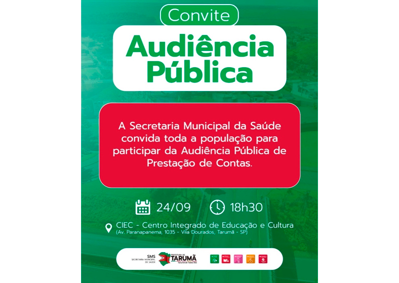 A Prefeitura de Tarumã, por meio da Secretaria Municipal da Saúde, realiza na noite desta quarta-feira, 24 de setembro, uma audiência pública de prestação de contas. O encontro será às 18h30 no Centro Integrado de Educação e Cultura (CIEC), localizado na Avenida Paranapanema, 1035, no bairro Vila Dourados.