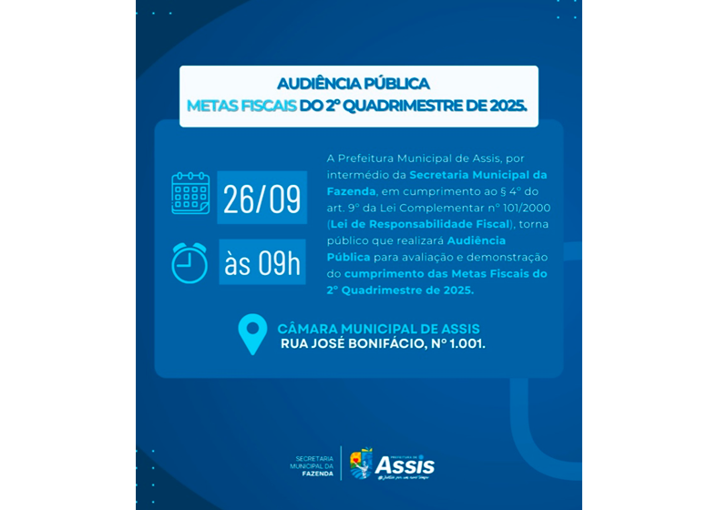 A Prefeitura Municipal de Assis, por meio da Secretaria Municipal da Fazenda, promove nesta sexta-feira, 26 de setembro, às 9h, uma audiência pública sobre o cumprimento das metas fiscais referentes ao 2º quadrimestre de 2025, que abrange os meses de maio a agosto. O encontro será realizado na Câmara Municipal de Assis, localizada na Rua José Bonifácio, 1001.