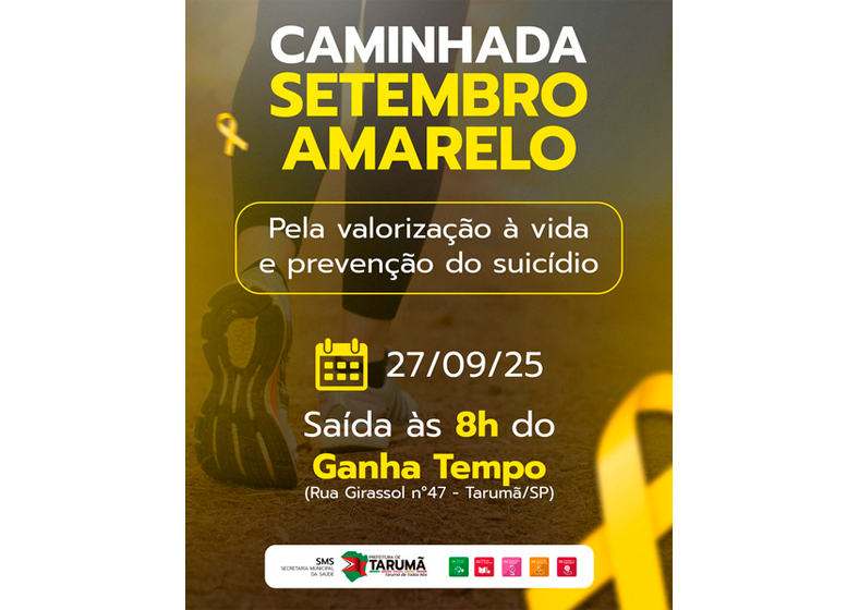 Na manhã deste sábado, 27 de setembro, Tarumã promove a Caminhada Setembro Amarelo, evento de conscientização que encerra as atividades do mês dedicado à prevenção ao suicídio e à valorização da vida. A concentração será às 8h, com saída do Ganha Tempo, localizado na Rua Girassol, 47.