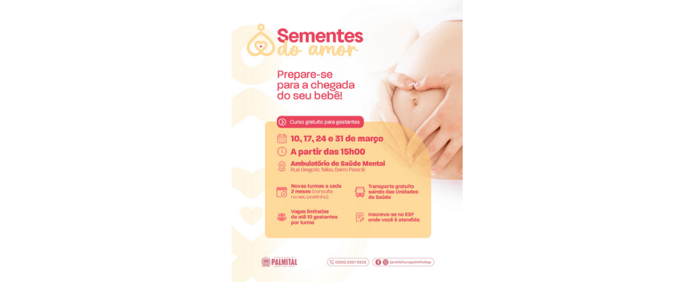 Gestantes atendidas pela rede pública de saúde de Palmital já podem se inscrever no curso gratuito “Sementes de Amor”, iniciativa voltada à preparação para a chegada do bebê. A atividade é promovida pela Prefeitura de Palmital e reúne encontros de orientação, acolhimento e troca de experiências entre futuras mães.