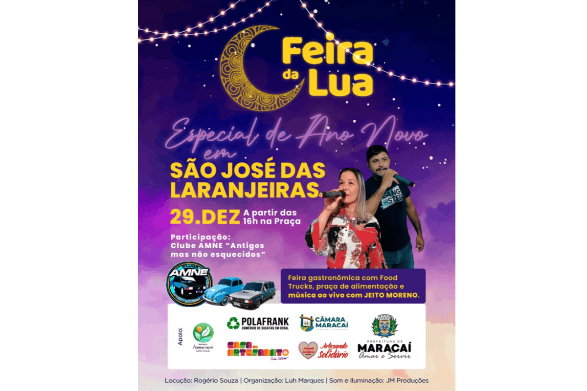 A tradicional Feira da Lua terá edição especial de Ano Novo nesta segunda-feira, 29 de dezembro, em São José das Laranjeiras, distrito de Maracaí, com início a partir das 16h, na praça central. A programação inclui feira gastronômica com food trucks, praça de alimentação e música ao vivo, reforçando o clima de confraternização que marca os últimos dias do ano na região.