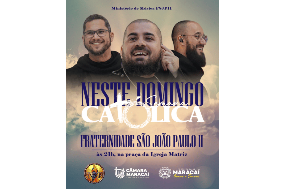 A Fraternidade São João Paulo II se apresenta neste domingo, 07 de dezembro, às 21h, na Praça da Matriz, em Maracaí, em mais uma atividade da Semana Católica 2025. O encontro é aberto ao público e reforça a programação dedicada à fé, à música e à participação da comunidade.
