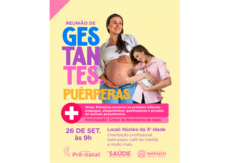 A Prefeitura de Maracaí, por meio da Secretaria Municipal de Saúde e do Projeto Pré-Natal, realiza nesta sexta-feira, dia 26 de setembro, às 9h, mais uma reunião especial destinada a gestantes e puérperas do município. O encontro acontecerá no Núcleo da 3ª Idade e será uma oportunidade de aprendizado, troca de experiências e orientação profissional.