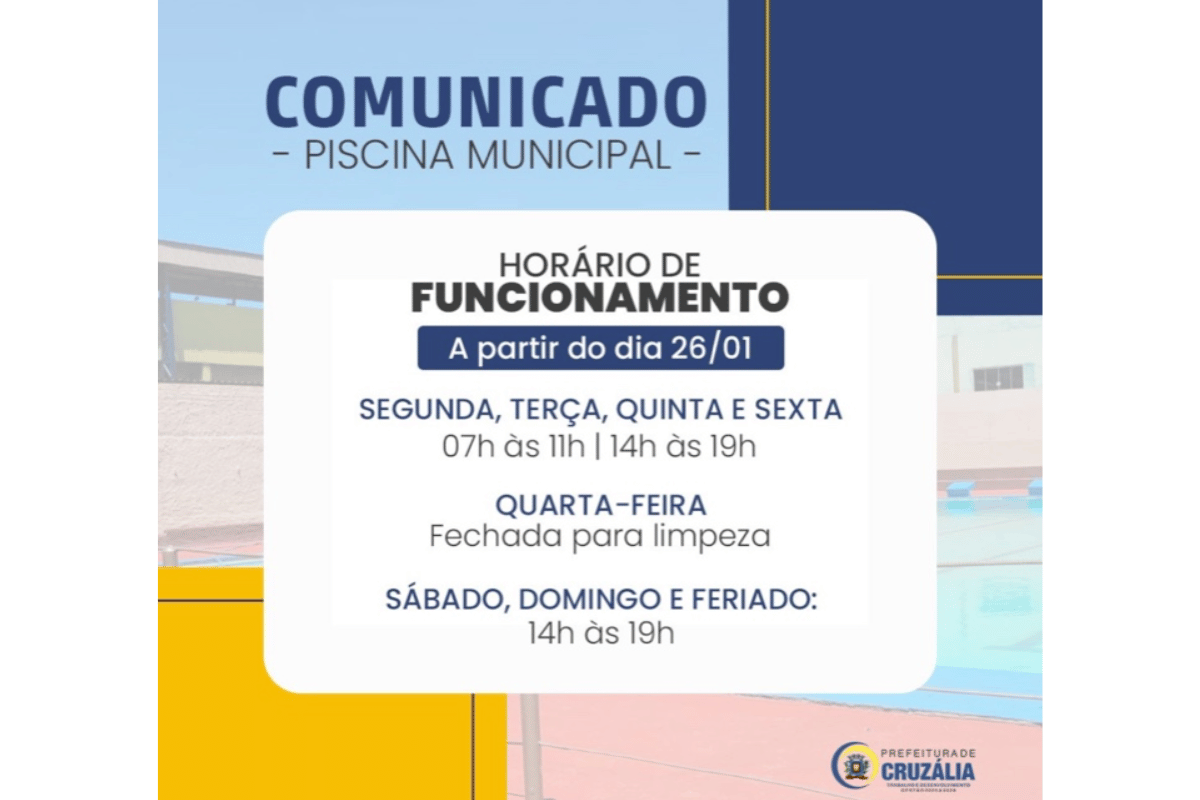 A Piscina Municipal de Cruzália passou a operar com novo horário de funcionamento a partir desta segunda-feira, 26 de janeiro, conforme comunicado divulgado pela Prefeitura. A medida amplia o período de uso do espaço e busca atender melhor a população durante a temporada de verão.