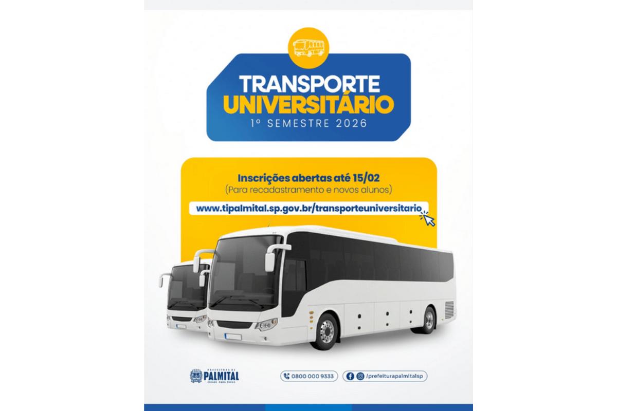 A Prefeitura de Palmital abriu as inscrições para o Transporte Universitário referente ao 1º semestre de 2026. O período de cadastro vai de 15 de janeiro a 15 de fevereiro e é destinado tanto a estudantes veteranos quanto a novos alunos que utilizam o serviço para se deslocar até instituições de ensino.