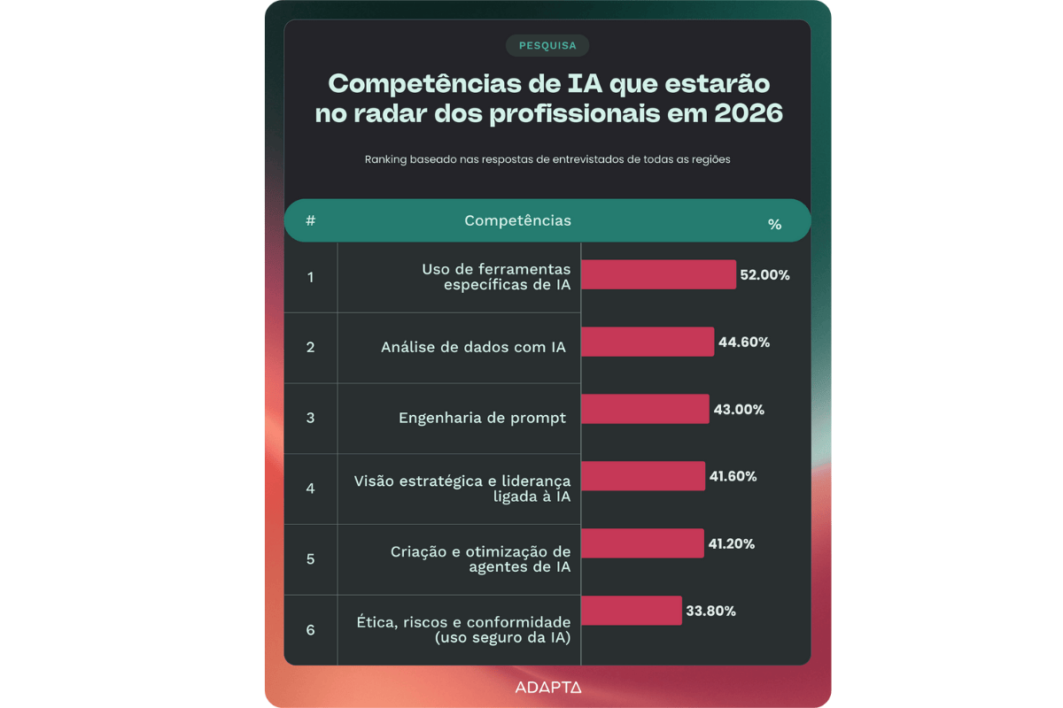 Quando questionados sobre quais habilidades pretendem desenvolver ou aprimorar, os profissionais demonstraram clareza. Entre as competências mais citadas estão a análise de dados com IA, apontada por 44,6%, e a engenharia de prompt, mencionada por 43%, vista como essencial para extrair resultados mais precisos das ferramentas.