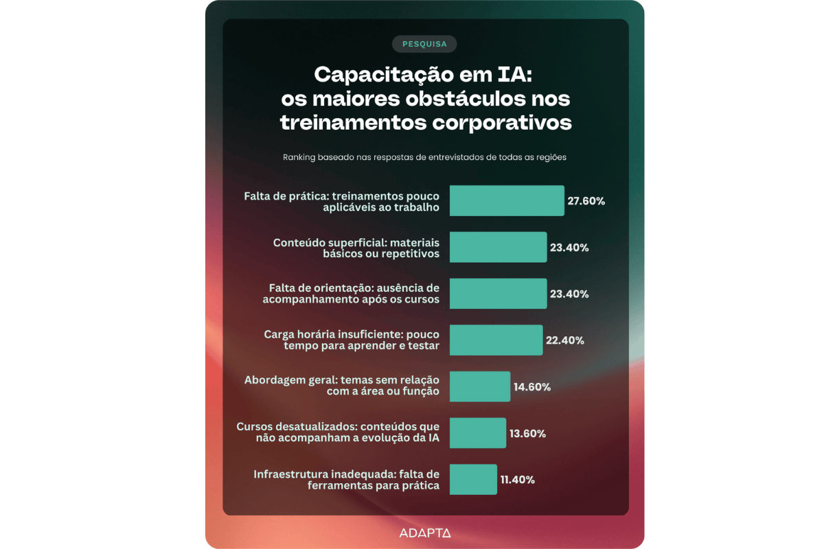 Apesar dos avanços, a qualidade das capacitações ainda é alvo de críticas. O principal problema apontado foi o excesso de teoria e a baixa aplicabilidade prática dos treinamentos, citado por 27,6% dos entrevistados. Outros 23,4% avaliaram os conteúdos como superficiais ou desatualizados, sem acompanhar a velocidade de evolução da IA.