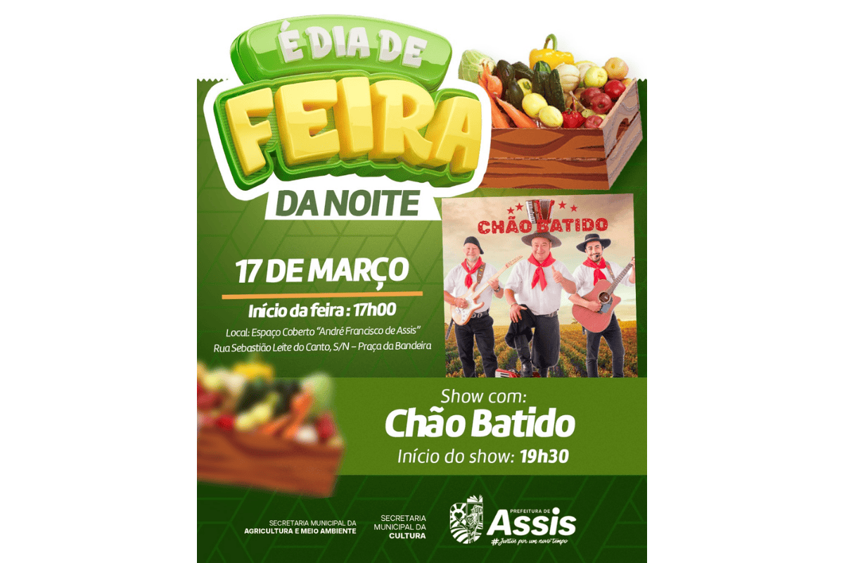 A tradicional Feira da Noite será realizada nesta terça-feira, 17 de março, em Assis, a partir das 17h, no Espaço Coberto André Francisco de Assis, localizado na Praça da Bandeira. O evento reúne produtores locais que oferecem frutas, verduras e diversos alimentos diretamente ao público, além de contar com programação cultural para os visitantes.