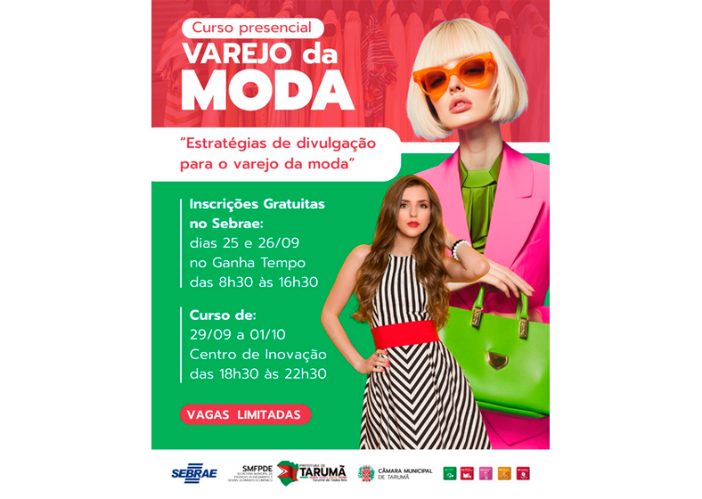 Termina nesta sexta-feira (26) o prazo para inscrições no curso presencial Varejo da Moda - Estratégias de Divulgação para o Varejo da Moda, realizado pelo Sebrae em parceria com a Prefeitura de Tarumã. As vagas são gratuitas e limitadas, e os interessados devem se inscrever no Sebrae, instalado no Ganha Tempo Municipal, das 8h30 às 16h30.